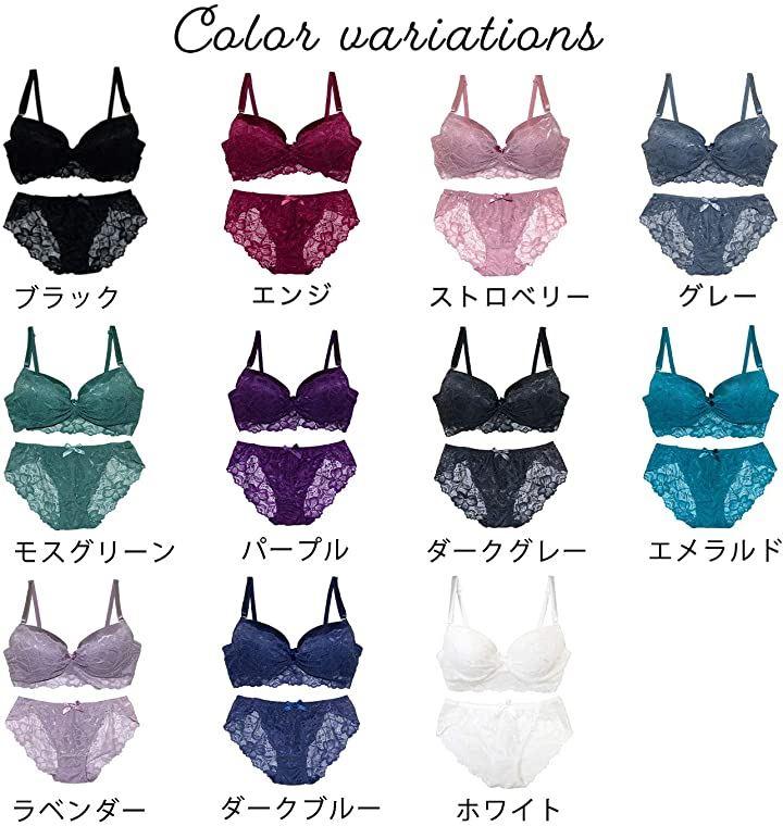 ・カラーは、エメラルド・エンジ・グレー・ストロベリー・ダークグレー・ダークブルー・パープル・ブラック・モスグリーン・ラベンダーの10色から、サイズはB65・B70・B75・C65・C70・C75・D65・D70・D75の9サイズからとなっております。