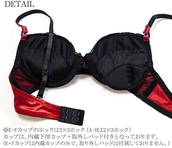 A-D:ストラップ取り外し可能/パッドポケットあり/取り外しパッド付き/ワイヤーあり/厚手カップ約1cm/伸縮性あり/ショーツフルバック/2x3ホック