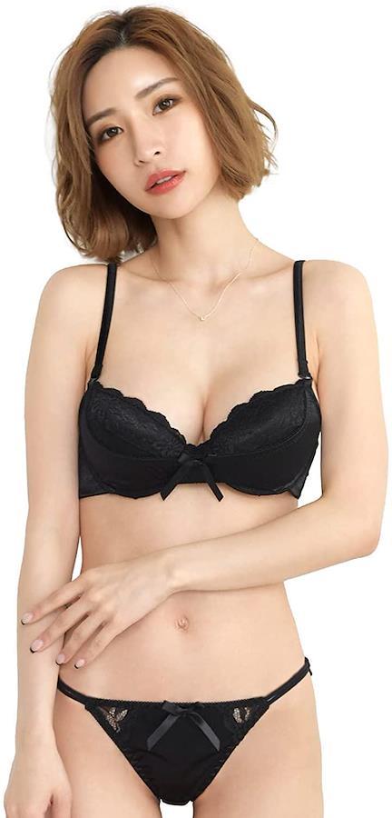 鎖骨と谷間を美しく魅せてくれる深めに開いた胸元や、ショーツサイドのゴム紐と透け感が大人の魅力を惹き出し、