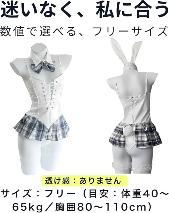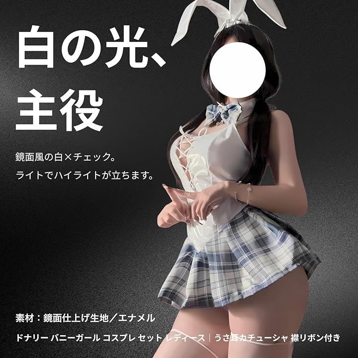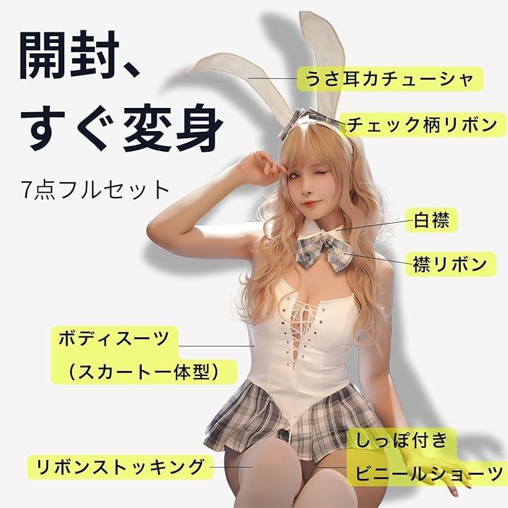 「一式で“うさぎ”になれる、光沢白xチェックのバニーコス」 うさ耳カチューシャ・襟リボン・しっぽ までそろうコスプレ用の衣装です。