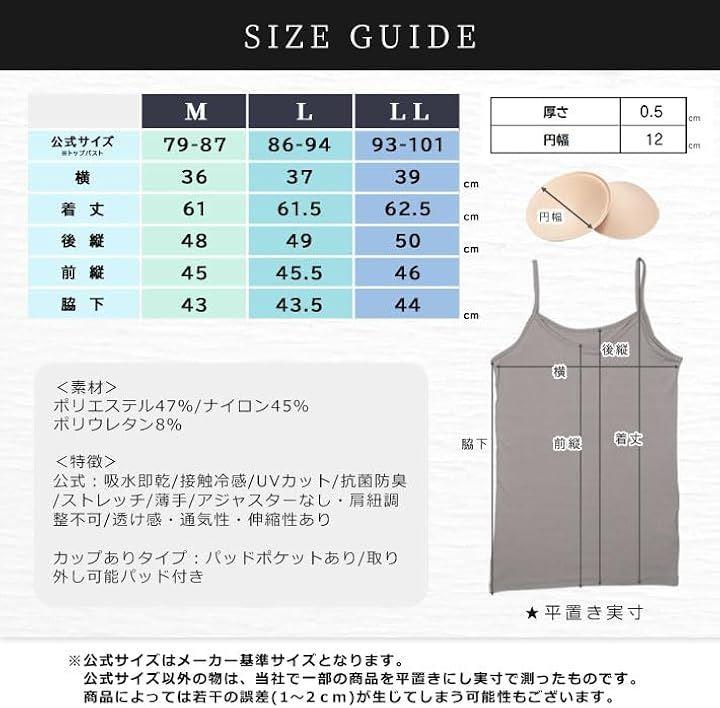 「特徴」カップ付き/パット付き/吸水速乾/接触冷感/UVカット/抗菌防臭/ストレッチ/アジャスターなし・肩紐調整不可/透け感・通気性・伸縮性あり