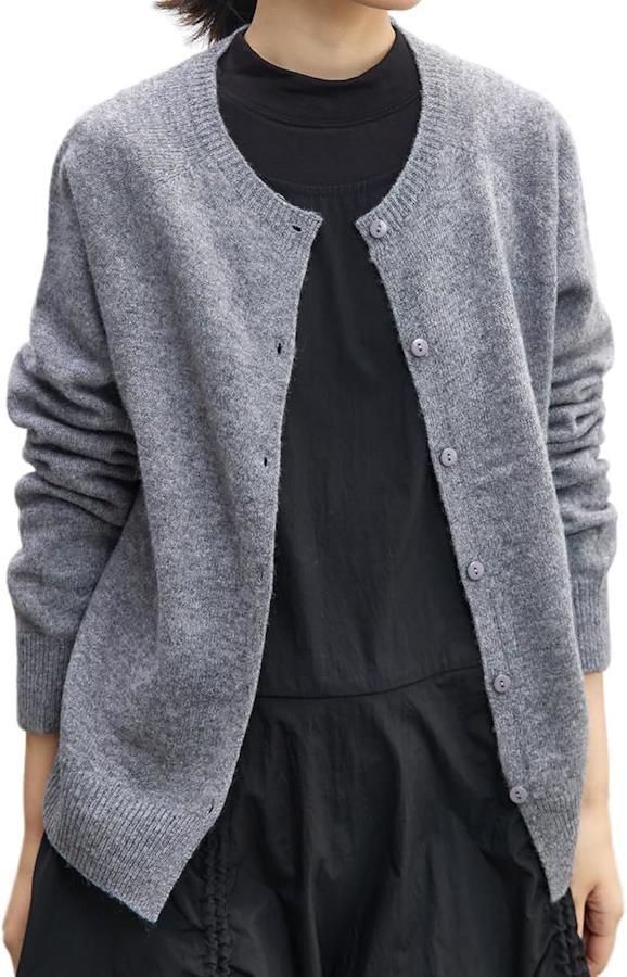 「トレンドアイテム」クルーネックカーディガンは首や肩が美しく見えます。