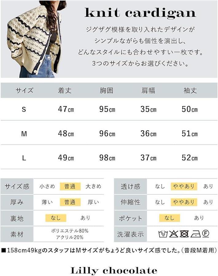 春や秋など季節の変わり目の羽織りとしても重宝し、カジュアルなお出かけや室内でのリラックスタイムにも使いやすいニットカーディガンになります。