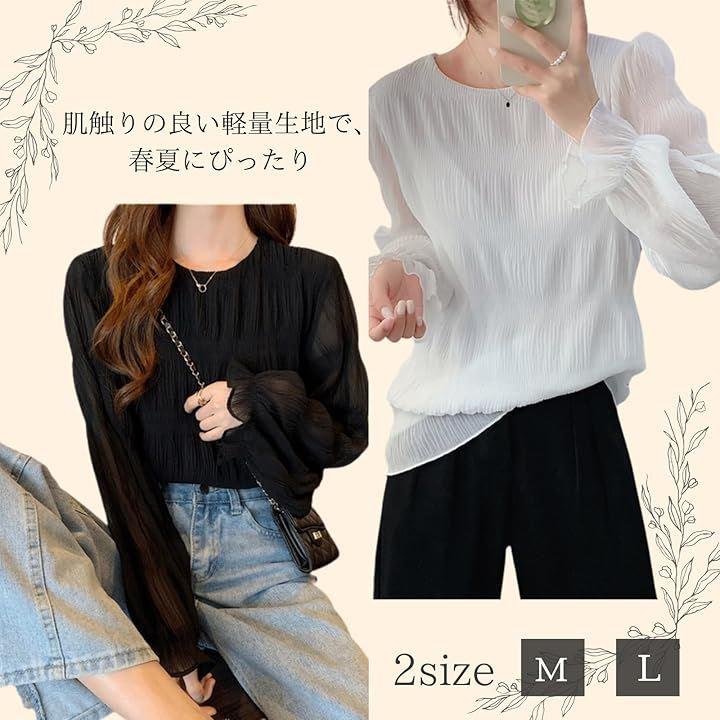 ・「軽やかで通気性抜群のシースルーブラウス」春夏秋の暑い季節やオフィスのエアコン環境で快適に過ごせる、透け感のあるエアリーな素材を採用した女性用フレアスリーブトップス。
