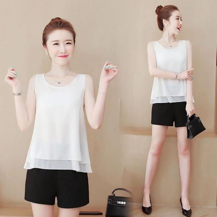涼しげな雰囲気のシフォンノースリーブブラウスは、上品な印象に。