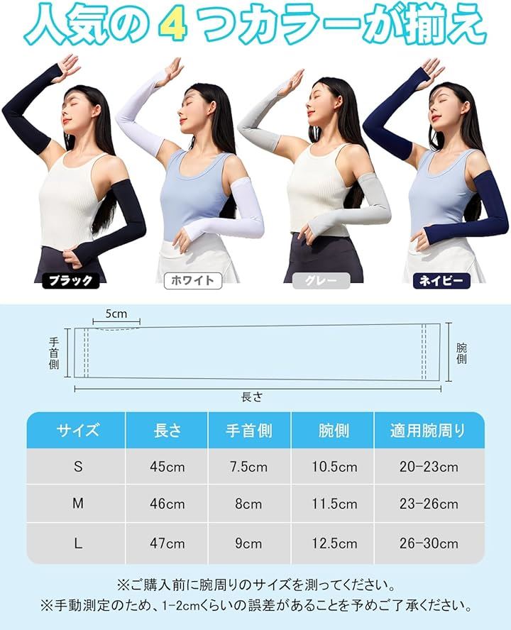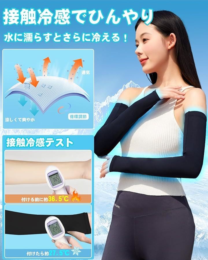 「接触冷感アームカバー」接触冷感素材を採用、水や汗で濡れると気化熱の作用により冷却効果があり、肌と接触した瞬間に温度を3-5度を下がるひんやり涼しいと感じられます。