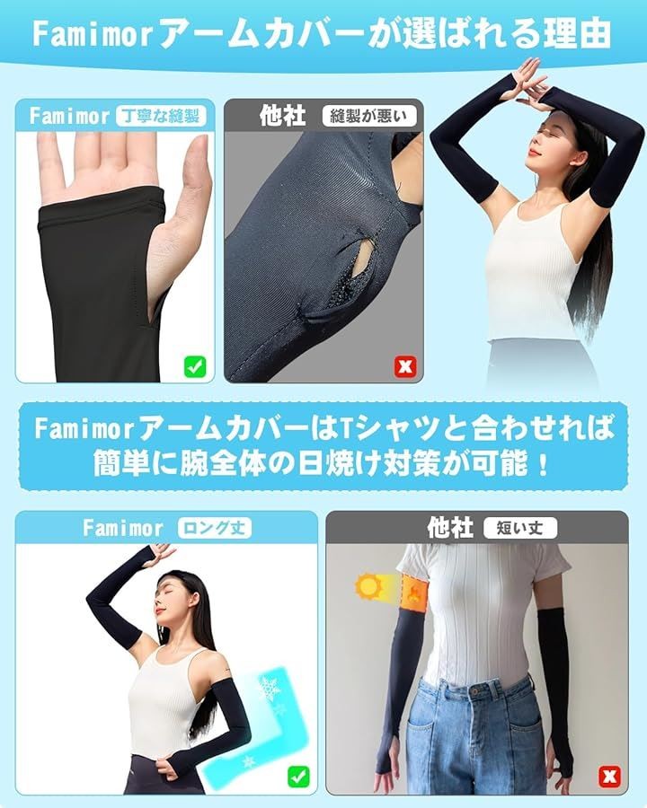 「ロング丈&フィット性」Famimorアームカバーは、一般の物より5cm長くなります。