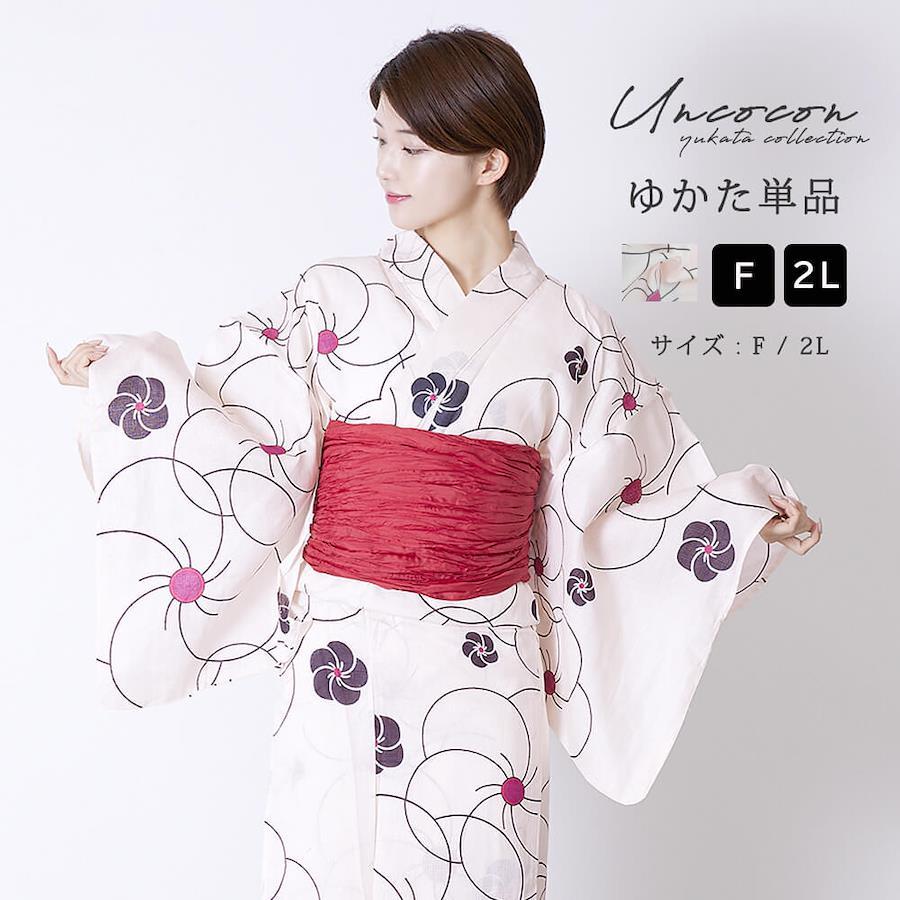 ふんわりやさしい生成色に咲く大輪の古典花が上品で華やか。綿麻素材の涼しさと高級感をあわせ持つ「古典の大輪花」は、夏祭りや花火大会で差がつく大人の浴衣スタイル。F・2Lサイズで体型に合わせて選べます。