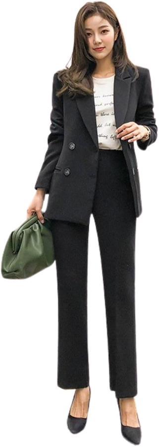 「モダンなスタイルと快適素材」 ダブルブレステッドジャケットとストレートパンツの組み合わせが、スマートでモダンなシルエットを実現。