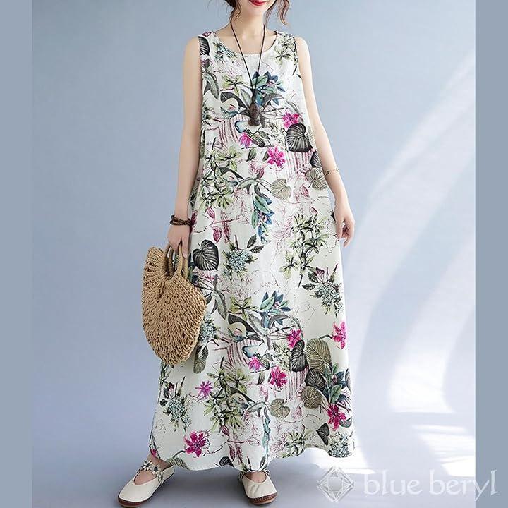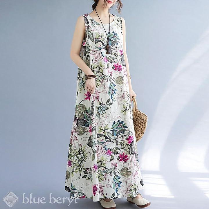 Women's Dress, Long, Botanical Print, A-Line, Sleeveless, Resort, Relaxed, Adult Casual, Slimming, Beautiful, High-End Look, Pattern, Stylish, Healthy, Silhouette, Unlined, BB041