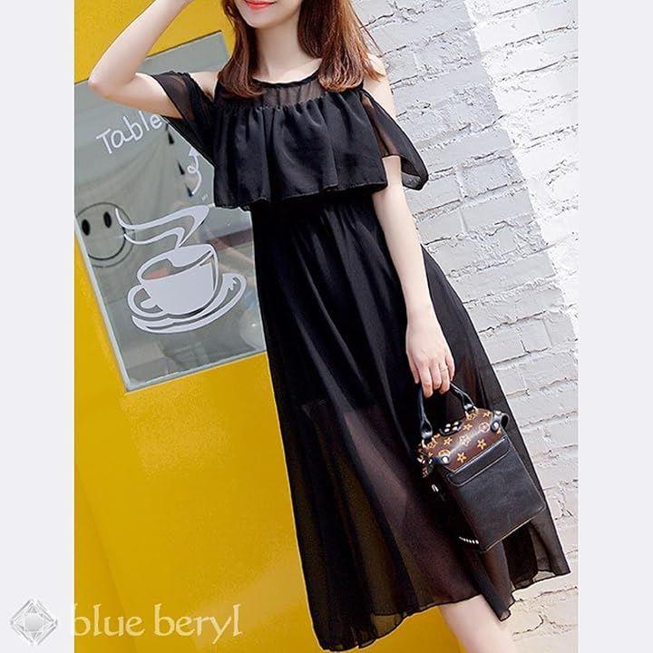 「オープンショルダーが甘さをプラス」 ハイウエストで緩やかなAラインのメリハリのあるシルエットに、胸元のフリルがスイートな華やかさたっぷりのワンピース。