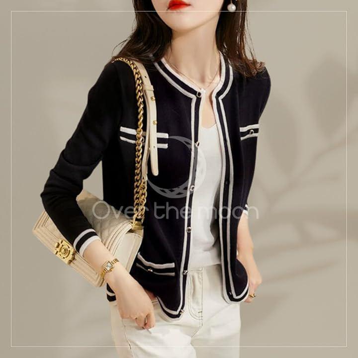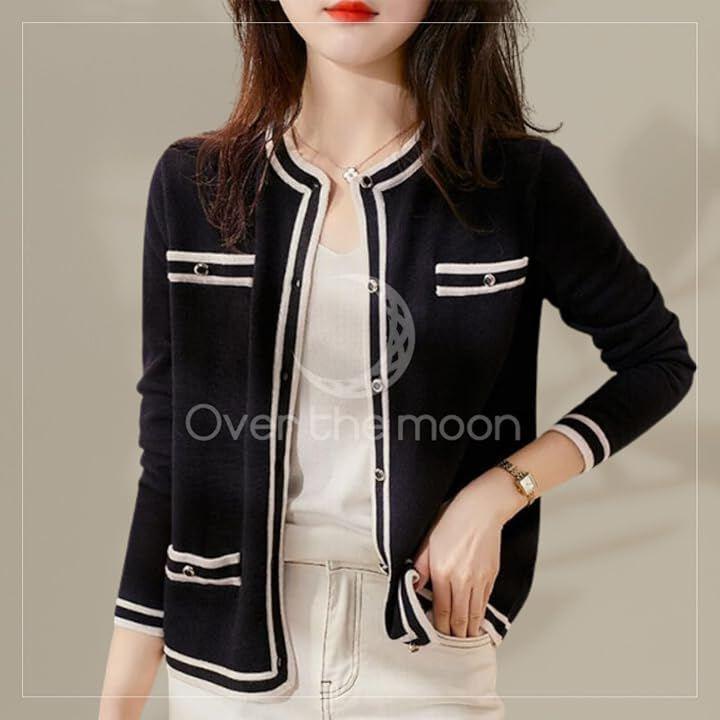 定番のクルーネックのカーディガンにパイピングでエレガントさをプラス。