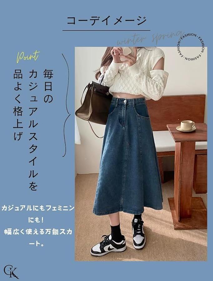 「美しく揺れるフレアシルエット」程よく広がるフレアデザインが上品で女性らしい印象を演出するデニムロングスカートです。