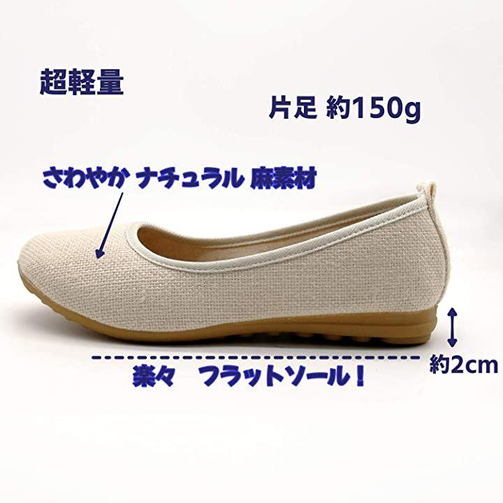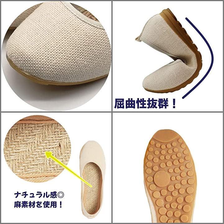 ・フラットシューズは柔らかくて丈夫な麻素材を使用しているから、軽くて足当たりもよく 屈曲性も抜群で、ラクラクな履き心地。