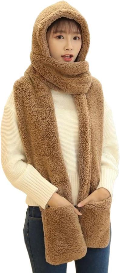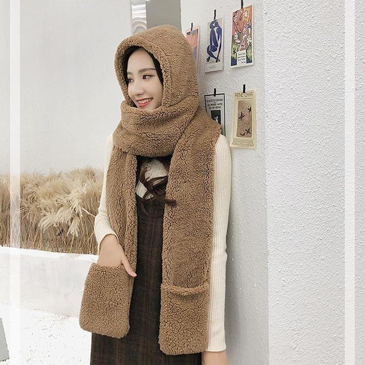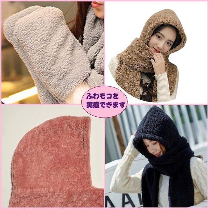 モコモコふわふわの気持ちいいボア素材のマフラーにフードと手袋が付いた多機能マフラーです。