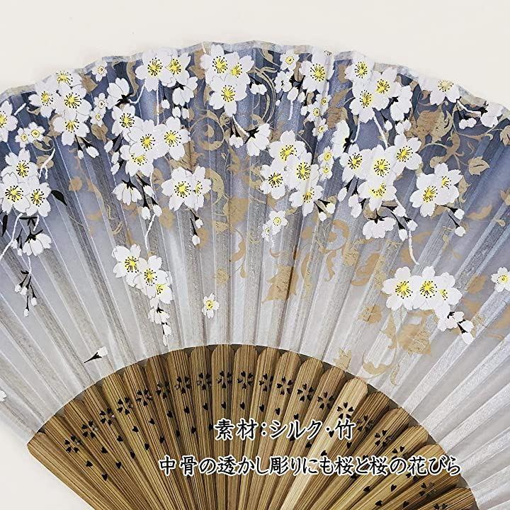 ほんのりとラメ感のあるシルク素材の扇面に銀色に縁どられた桜が描かれています。