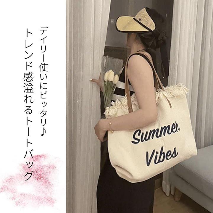 「シンプルでおしゃれなトートバッグ」キャンバストートバッグの口にあしらったフリンジデザインが、可愛さを引き立てています。