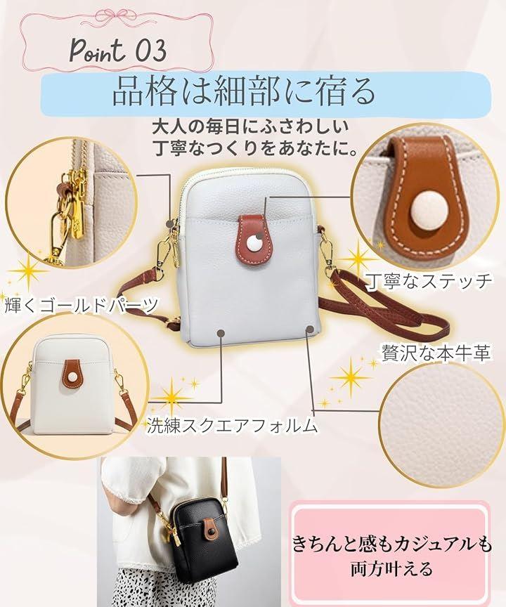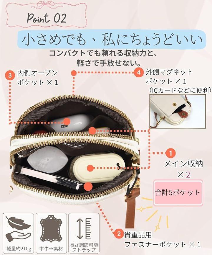 「商品の詳細仕様」 素材:牛革(本革) サイズ:本体:高さ約18cmx幅約15cmx厚さ6cm、ストラップ幅:約1.1cm、ストラップ長さ:約70cm~140cm(調整可能) 重さ:約210g ポケット構成:合計5ポケット(メイン収納x2、貴重品用ファスナーポケットx1、外側マグネットポケットx1、内側オープンポケットx1) カラー展開:ブラック、グリーン、カーキ、アイボリー 機能:2WAY仕様(斜めがけ、肩掛け)