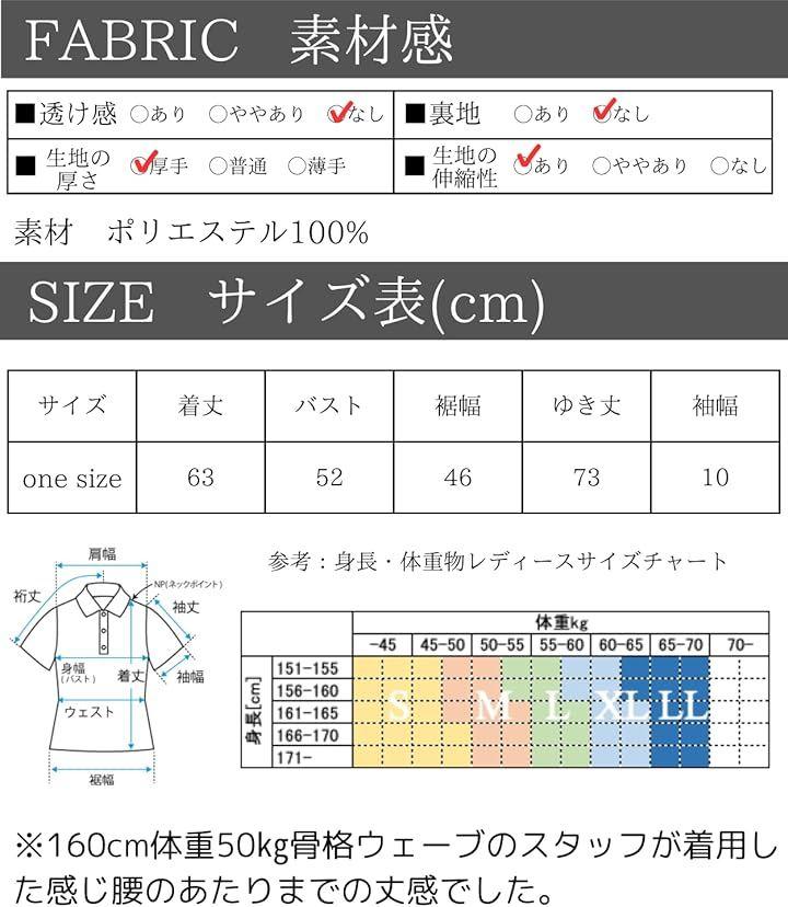 「素材」ポリエステル100% 「カラー」黒、茶色、青、緑「サイズ(cm)」one size 着丈63/バスト52/裾幅46/ゆき丈73/袖幅10
