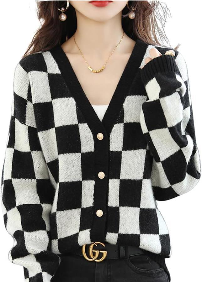 Women's Gingham Check Cardigan, Patterned Top, Office Knit, Warm, Button-Down, Long Sleeve