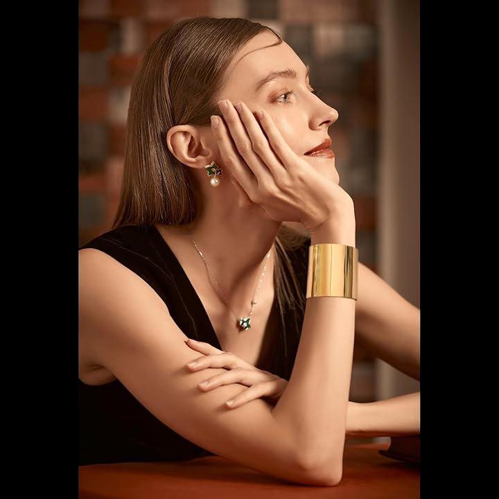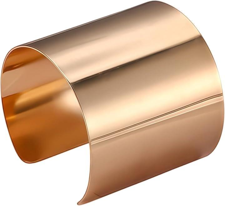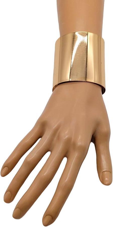 ゴールドのバングルは存在感のあるワイド幅が特徴で、手首をすっきりと見せながら上品な印象を演出。