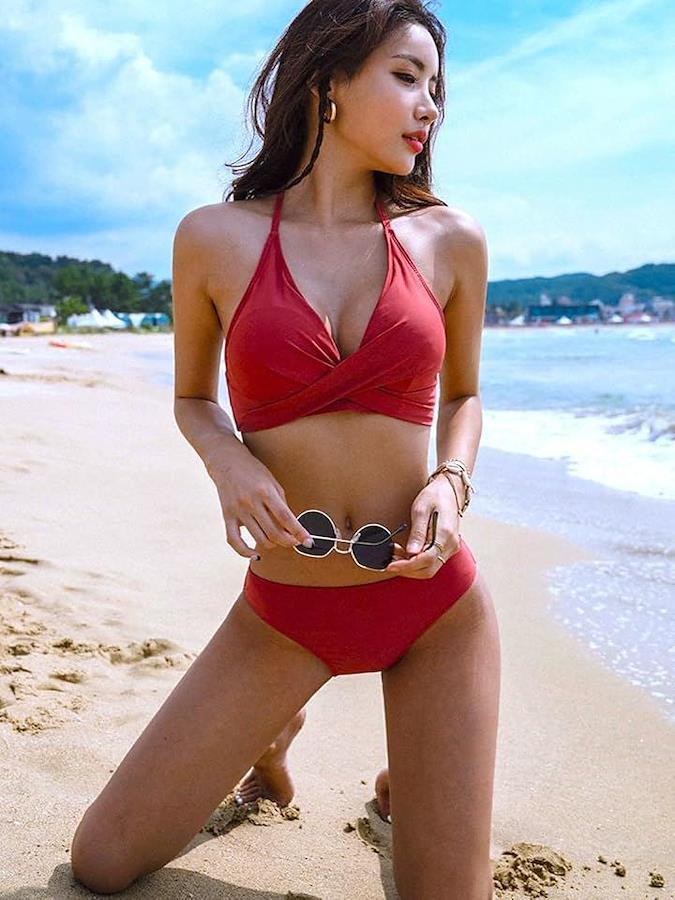 正面で布をクロスさせて巻き付けたようなカシュクールがリッチでスタイリッシュに見せてくれるビキニ。