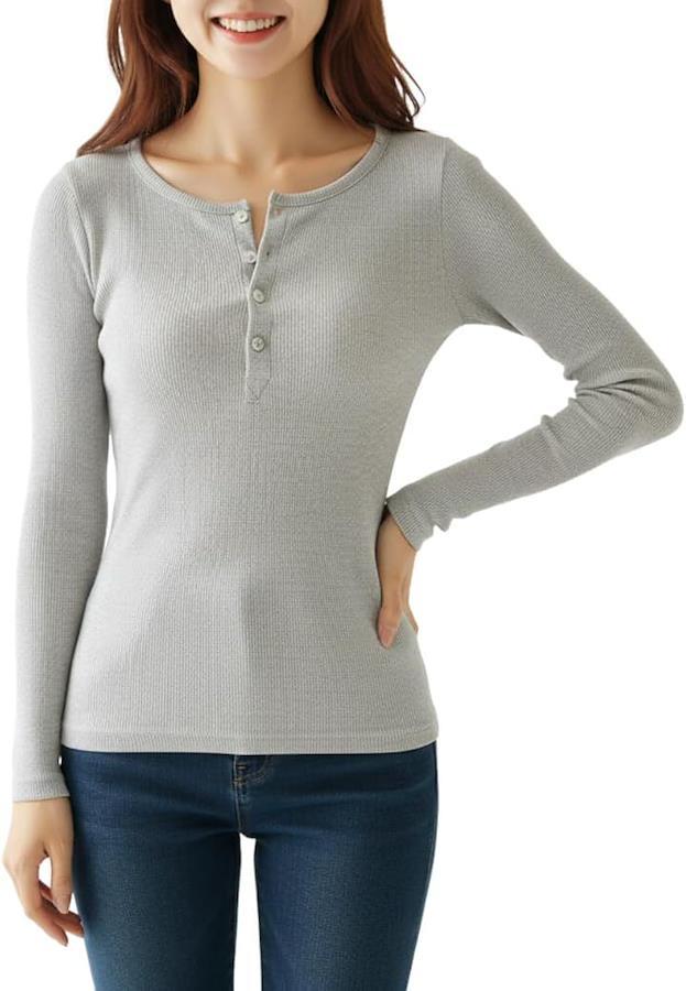 デコルテ美人を演出するヘンリーネックと、細見えリブでスタイルアップ。