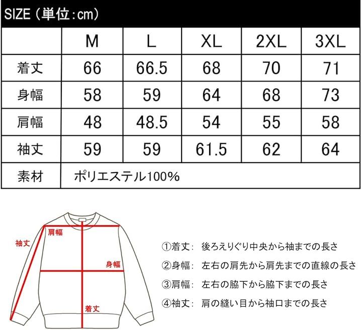 「サイズ」「M」着丈66 / 身幅58 / 肩幅48 / 袖丈59・「L」着丈66.5 / 身幅59 / 肩幅48.5 / 袖丈59・「XL」着丈68 / 身幅64 / 肩幅54 / 袖丈61.5・「2XL」着丈70 / 身幅68 / 肩幅55 / 袖丈62・「3XL」着丈71 / 身幅73 / 肩幅58 / 袖丈64 *サイズに多少の誤差がある場合がございます。