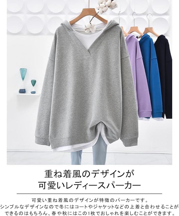 「多くの季節で使えるパーカー」冬にはコートやジャケットなどの上着と合わせることができるのはもちろん、春や秋にはこの1枚でおしゃれを楽しむことができます。