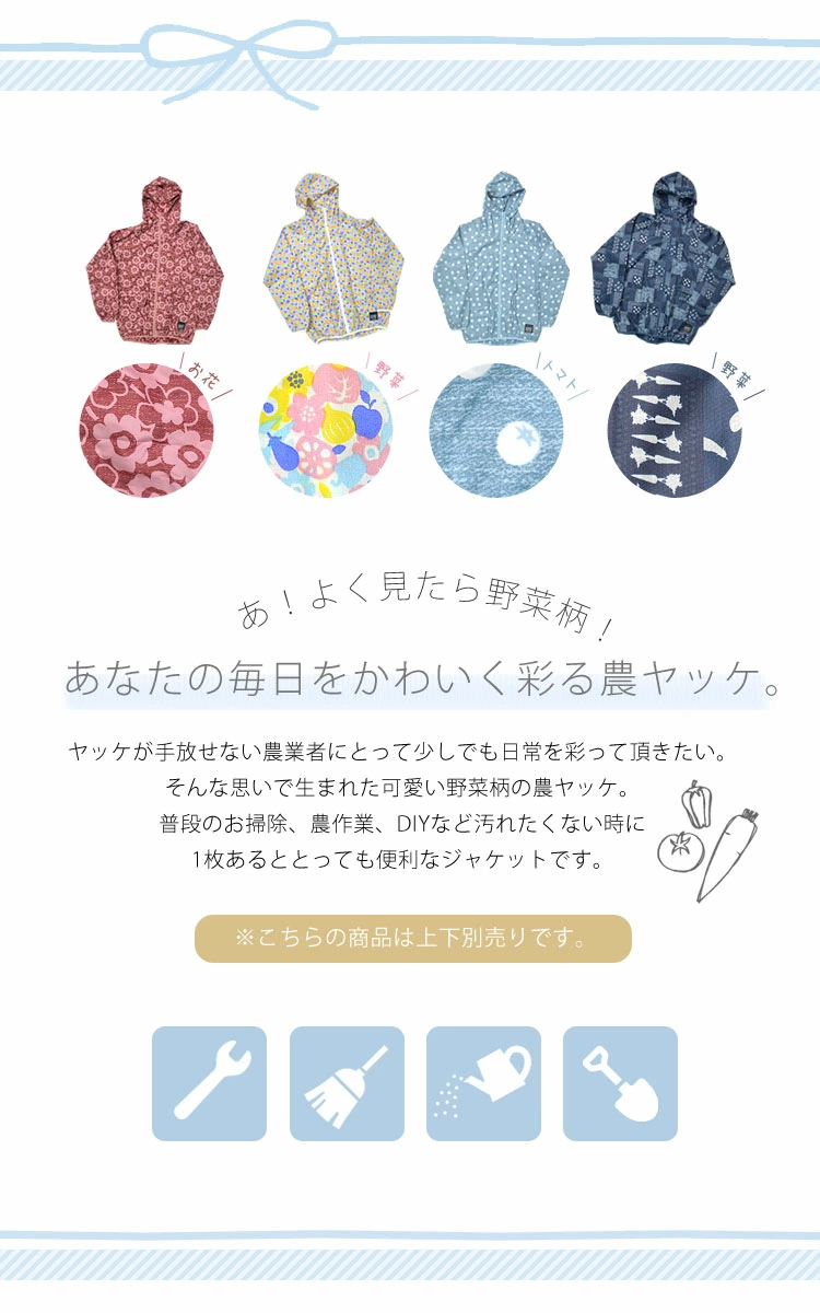 ゆったりサイズで重ね着らくらく、日常を彩るレディースヤッケです。ヤッケが手放せない農業従事者さんにとって少しでも日常を楽しく彩っていただきたい。そんな思いで作った「農ヤッケ」です。
