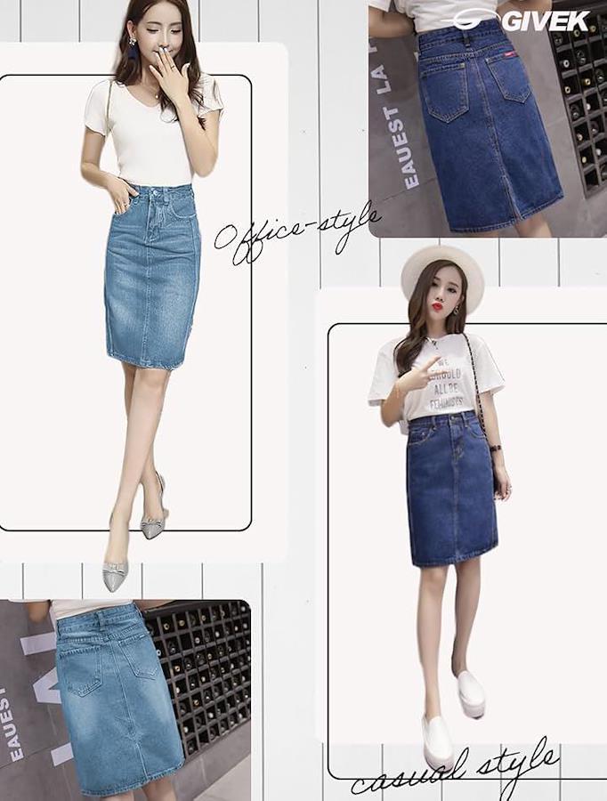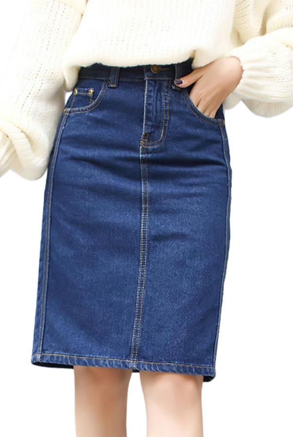 「美シルエットを叶えるタイトライン」 程よくボディラインにフィットし、女性らしい曲線美を引き立てるタイトタイプの膝丈デニムスカートです。