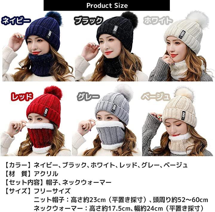 「カラー」ネイビー、ブラック、ホワイト、レッド、グレー、ベージュ「材質」アクリル「セット内容」帽子、ネックウォーマー「サイズ」「サイズ」フリーサイズ、ニット帽子:高さ約23cm(平置き採寸)、頭周り約52~60cm、ネックウォーマー:高さ約17.5cm、幅約24cm(平置き採寸)