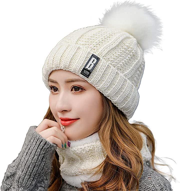 Women's knit hat and neck warmer set with fleece lining