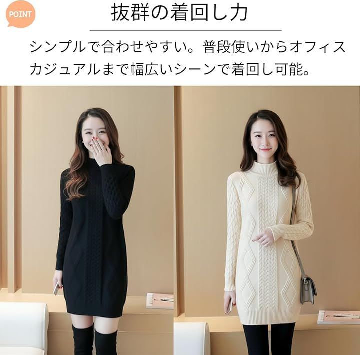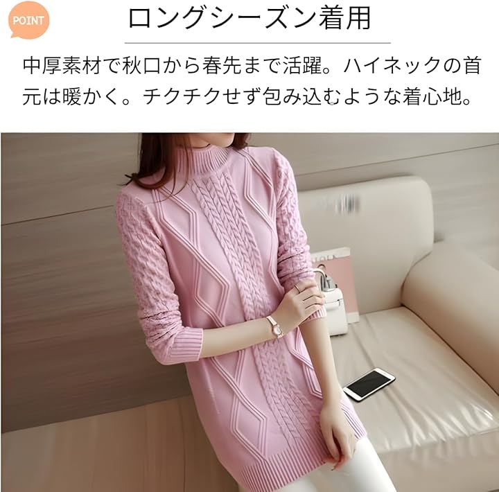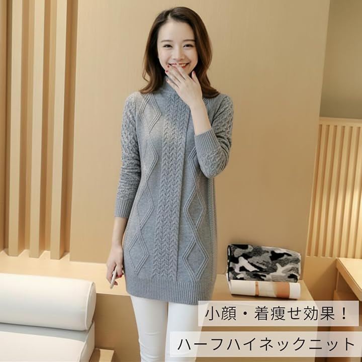 「ハイネック・小顔効果」ハーフハイネックのニットチュニックは首元をすっきり見せ、顔周りを自然に小顔に演出。