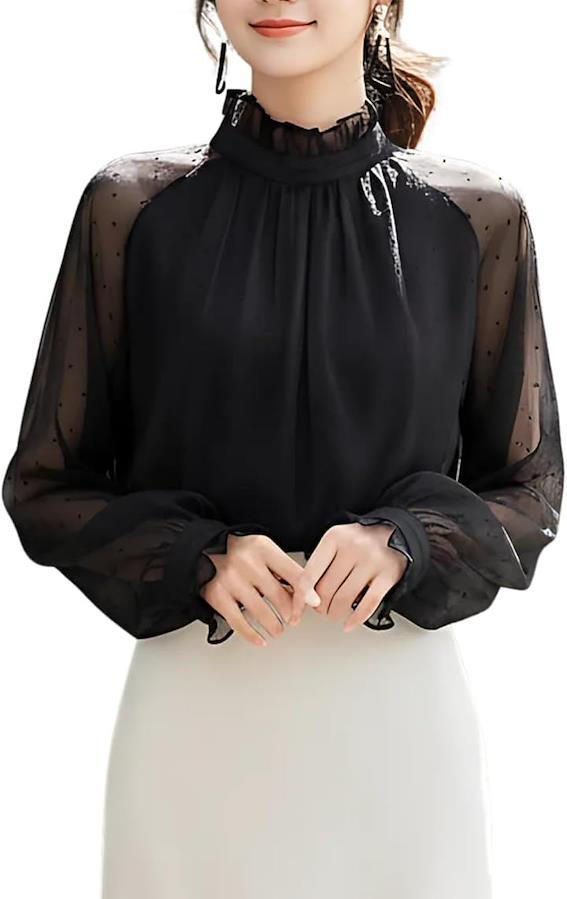 Women's lace blouse with see-through sleeves, long sleeves, and a beautiful, plus-size lace top with a high neck.