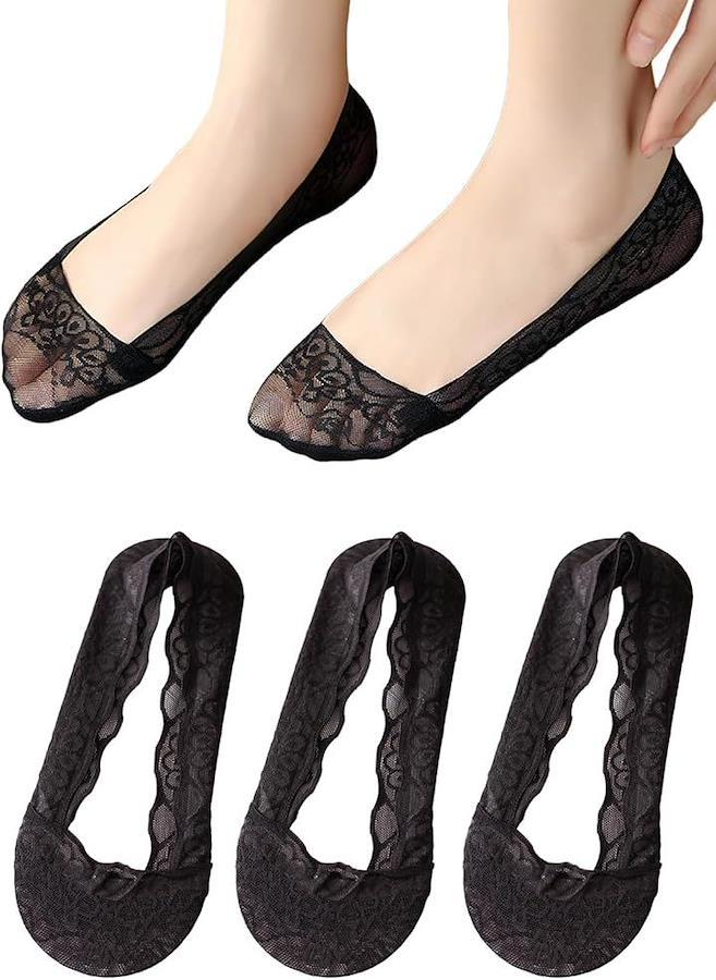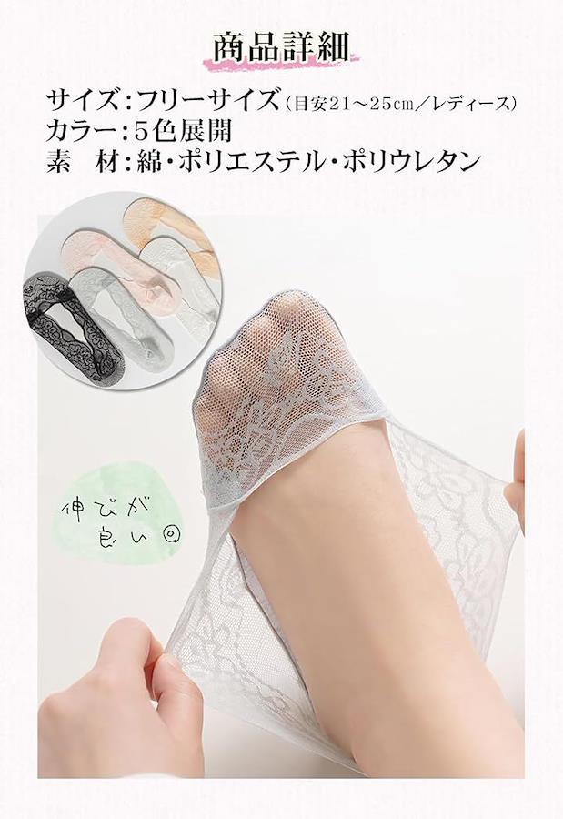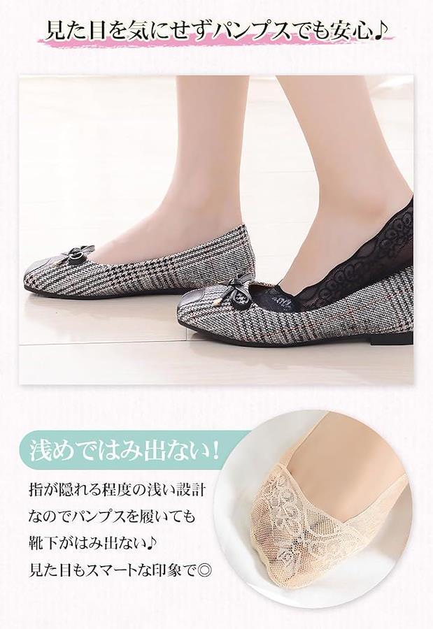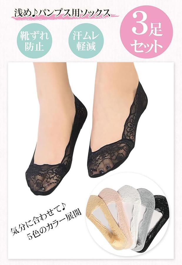 浅履きデザインなのでパンプスやバレエシューズから見えにくく、すっきりとした印象を保ちながら、華やかなレースが女性らしさを引き立てます。