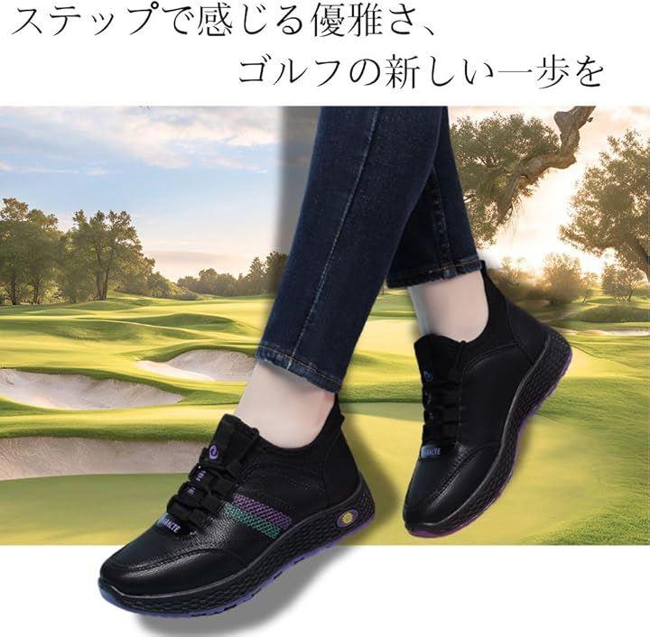 「スタイリッシュカジュアルスタイルデザイン」ゴルフシューズでありながら、日常にも溶け込むおしゃれなデザインが魅力。 機能性だけでなく、モダンなカラーリングと女性らしいシルエットを抑えたこのシューズは、ゴルフ場でも街中でもファッショナブルな印象を与えます。