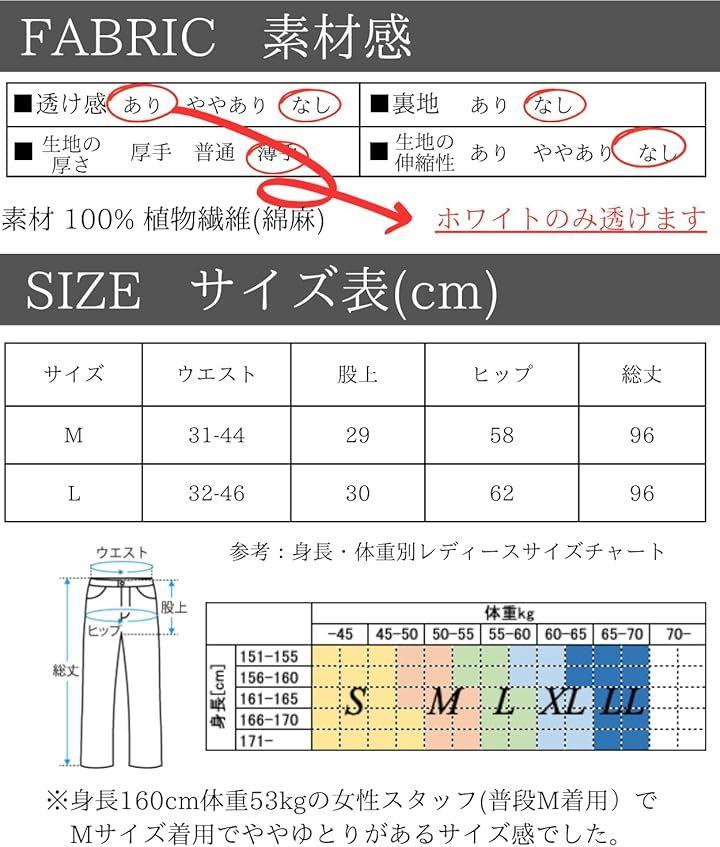 「素材」100% 植物繊維(綿麻 綿95% 麻5%)「カラー」ブラック(黒色)、ホワイト(白色)、グリーン(緑色)、グレー(灰色)「サイズ(cm)」M 総丈96/ウエスト31-44/ヒップ58 L 総丈96/ウエスト32-46/ヒップ62