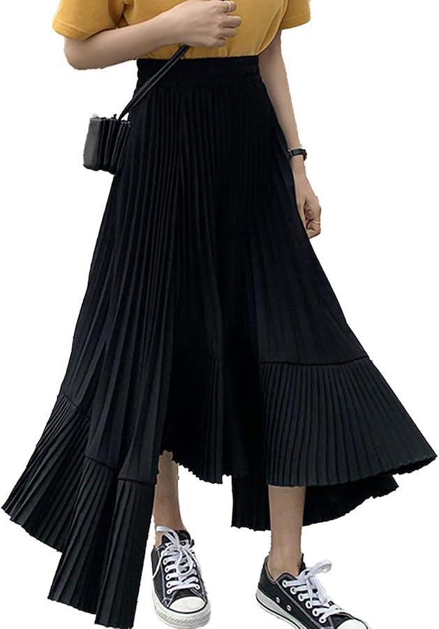Women's long, asymmetrical pleated skirt with a modern, high-waisted, flared, and elastic waistband. Perfect for everyday wear, this solid, gathered skirt features a tulle hem and a cool, stylish, and unique design.