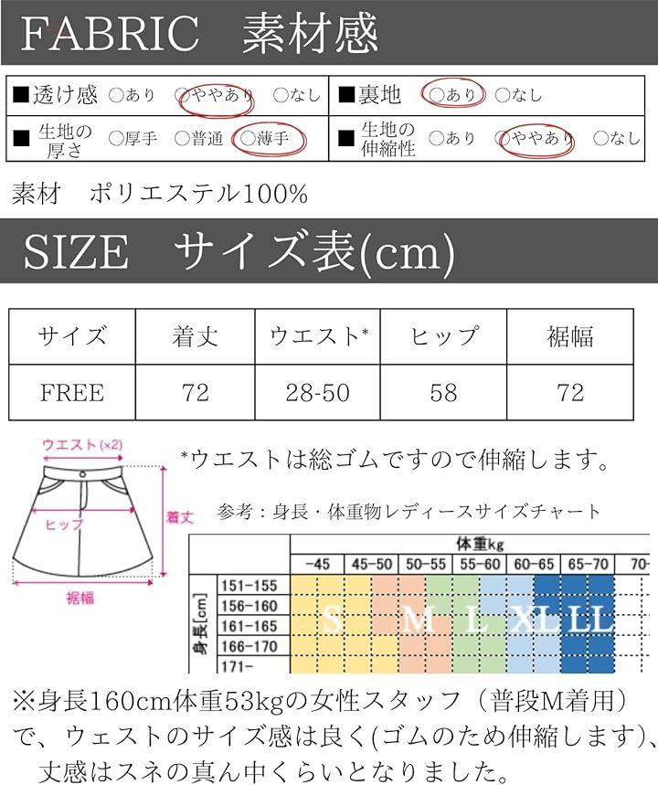 「素材」ポリエステル100% 「カラー」ブラック、グレー、ブラウン、ライトブラウン「サイズ(cm)」FREE 着丈72 ウエスト28-50 ヒップ58 裾幅72