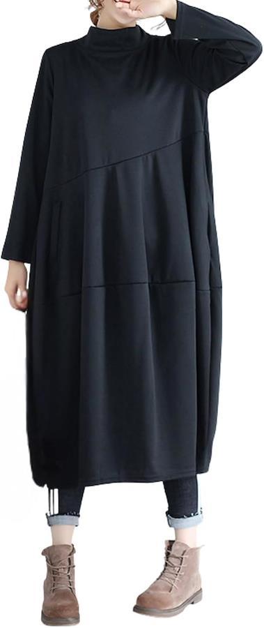 Women's Long Sleeve A-Line Dress with Flattering High Neck, Solid Color, Perfect for Commuting, Loungewear, or One-Mile Wear, this Tunic/Cocoon Dress is Midi-Length