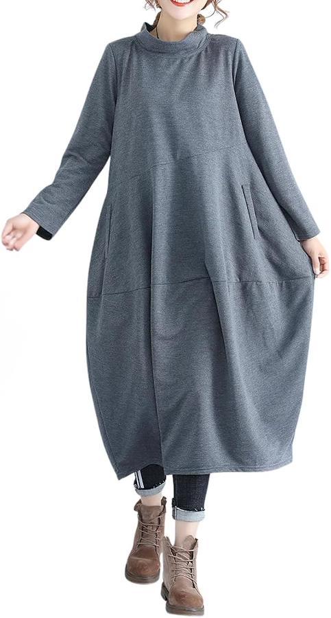 Women's Long Sleeve A-Line Dress with Flattering High Neck, Solid Color, Perfect for Commuting, Loungewear, or One-Mile Wear, this Tunic/Cocoon Dress is Midi-Length