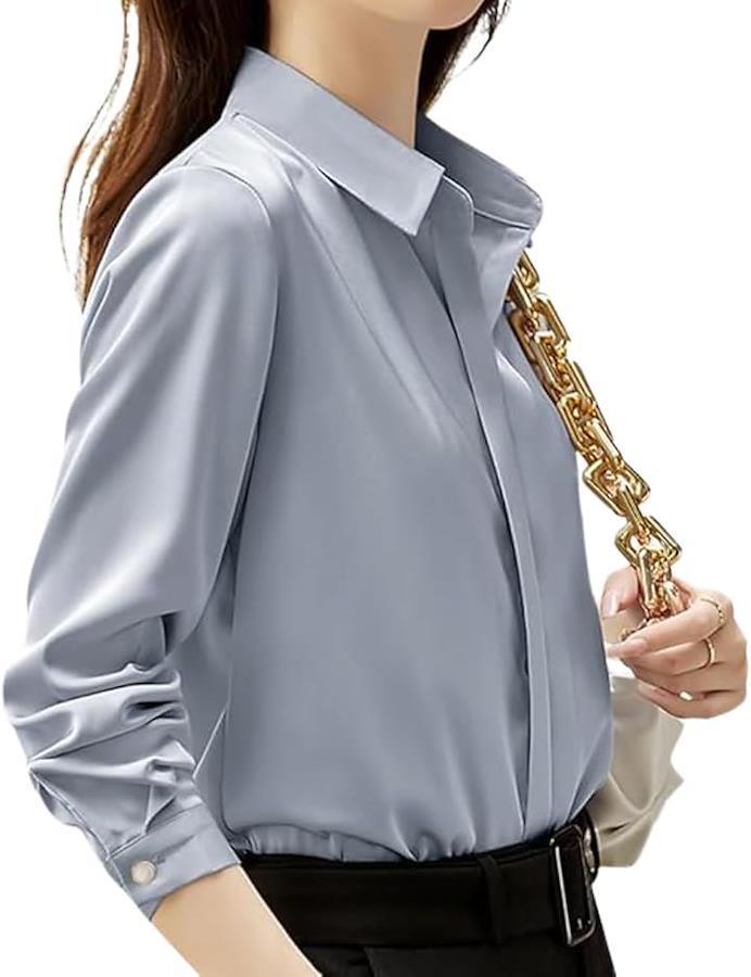 動くたびにやわらかく光を反射し、女性らしさを際立たせるサテン調素材を使用したシャツです。