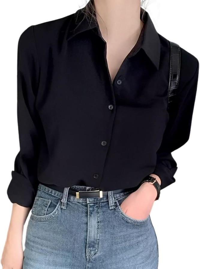 Women's Long Sleeve Chiffon Shirt with Polo Collar, Solid Color, Perfect for Commuting, Office Casual, and Formal Wear. This Korean-style top offers a flattering, figure-flattering look.