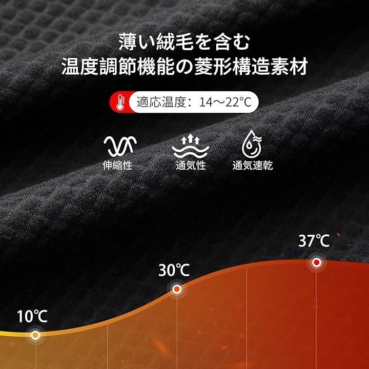 「裏起毛素材」全新薄い絨毛を含む温度調節機能の菱形構造素材(着用適温:14~22℃)、伸縮性と通気性に優れ、湿気除去と急速乾燥性能を備えた質地です。