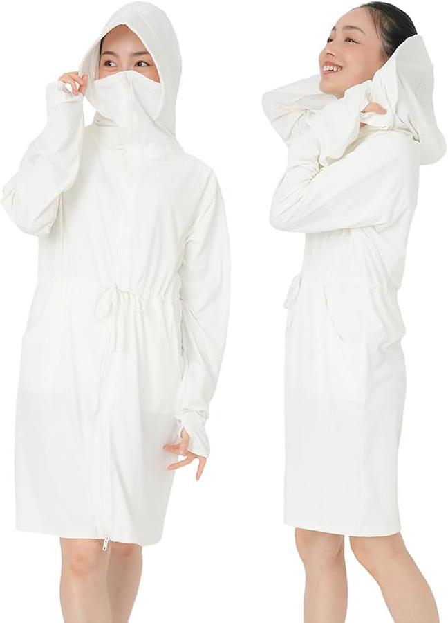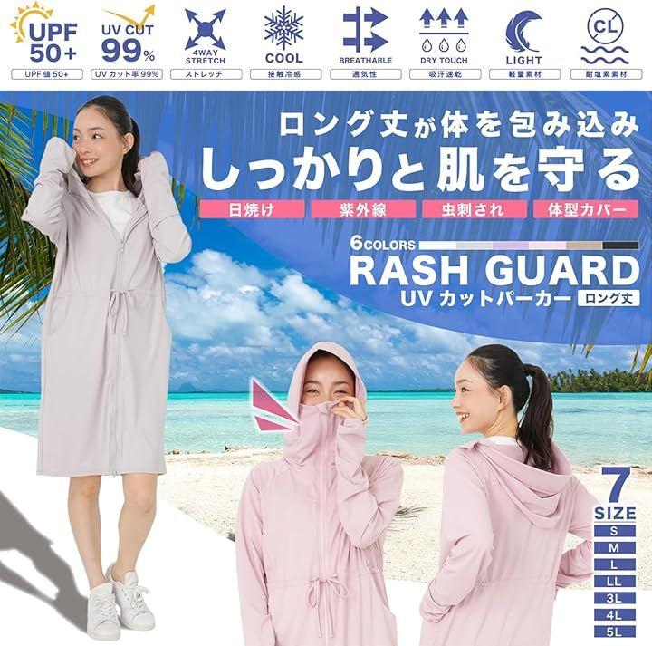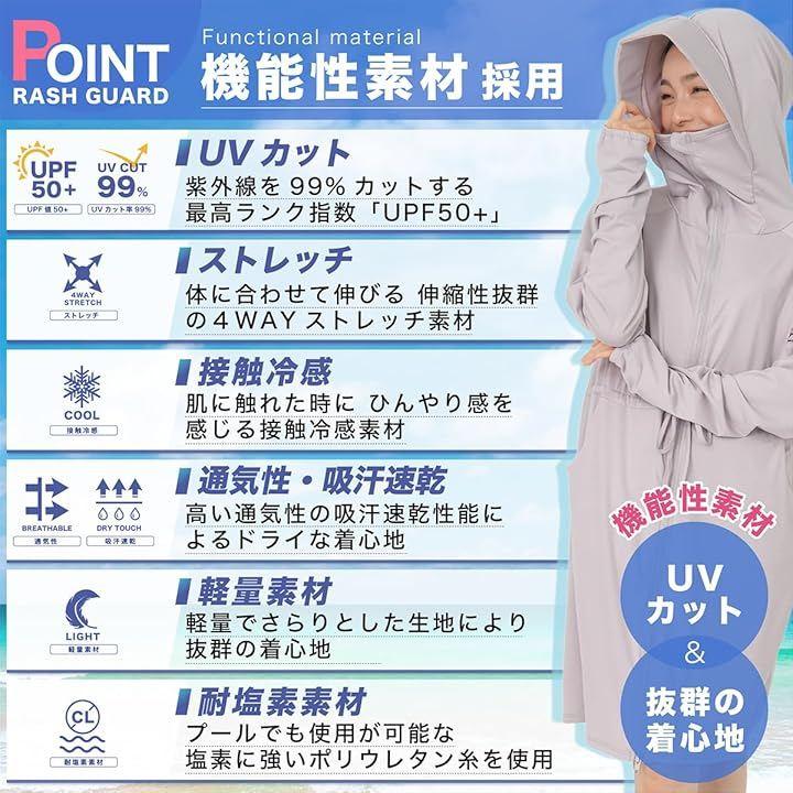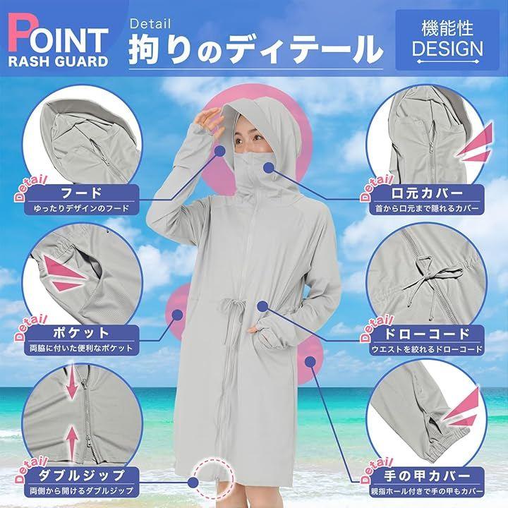 v紫外線99%カット、接触冷感素材、軽量素材、吸汗速乾素材、耐塩素素材、ロング丈、ゆったりフード、虫刺され予防、首元の日焼け対策、手の甲の日焼け対策、前面ダブルジップファスナー