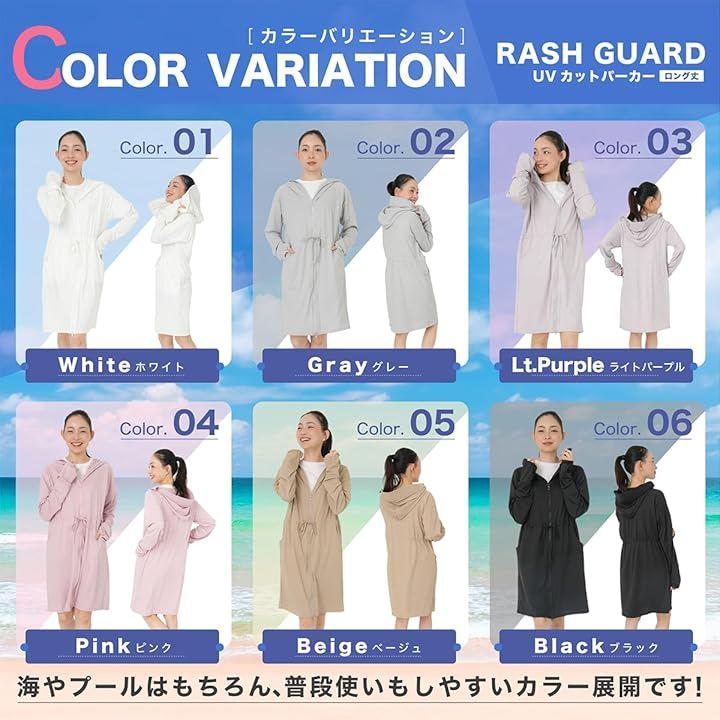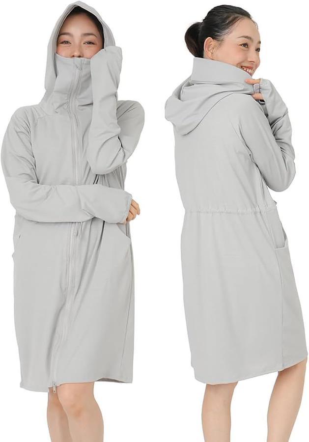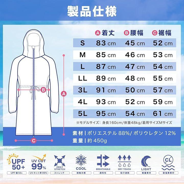 v紫外線99%カット、接触冷感素材、軽量素材、吸汗速乾素材、耐塩素素材、ロング丈、ゆったりフード、虫刺され予防、首元の日焼け対策、手の甲の日焼け対策、前面ダブルジップファスナー