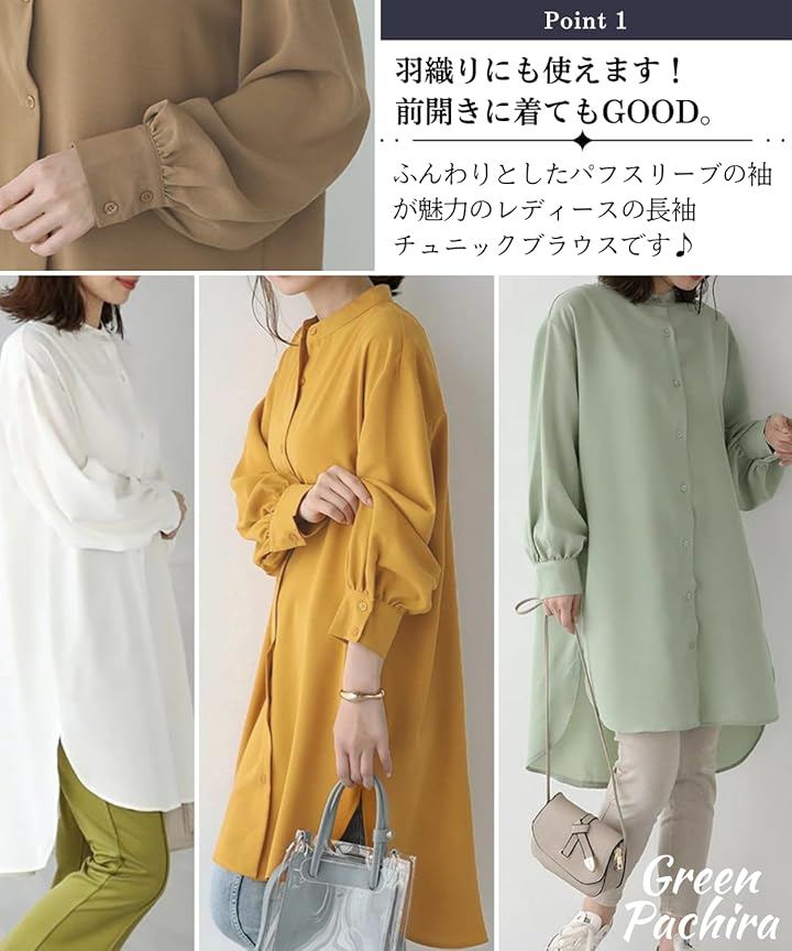 「上品デザイン」スタンドカラーとパフスリーブで女性らしさを演出しつつ、すっきりとした印象に仕上げました。