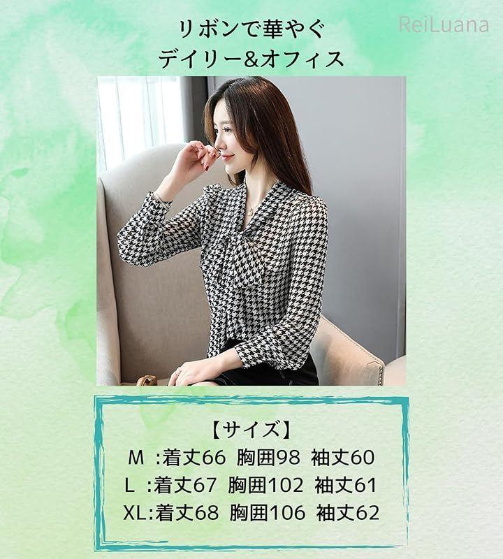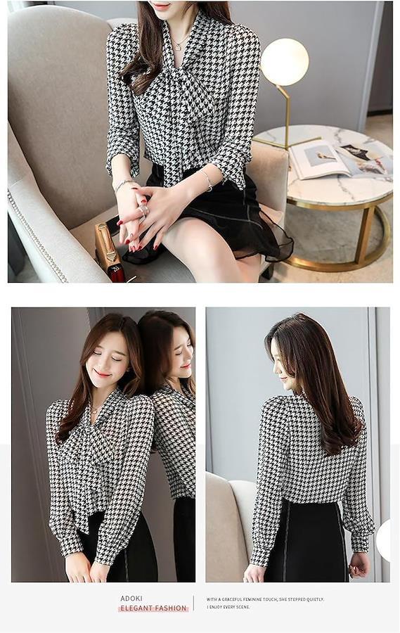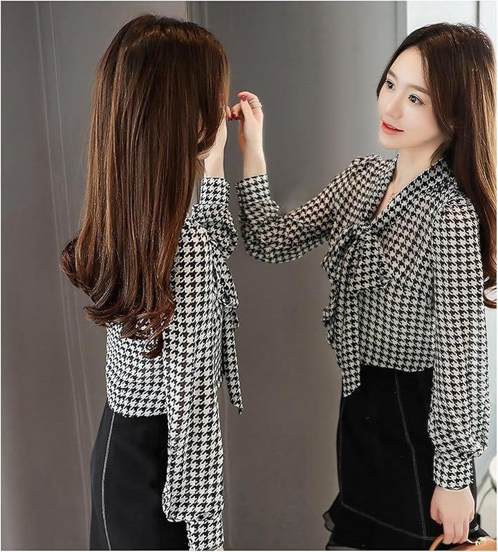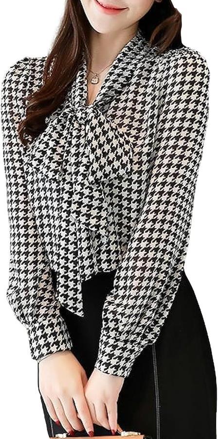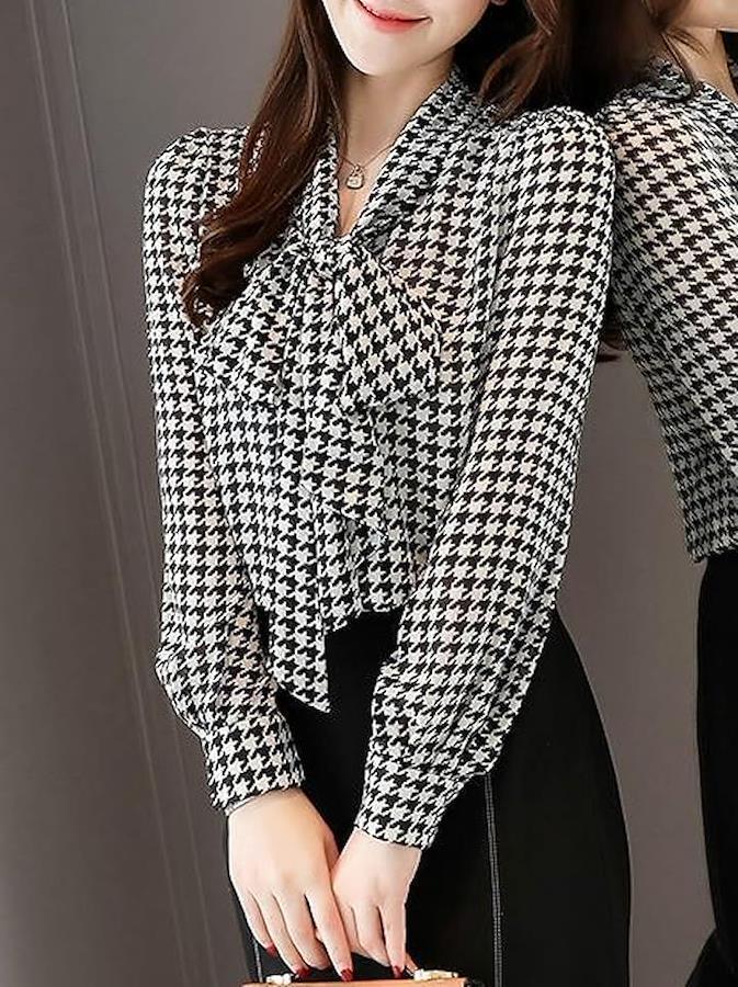 千鳥格子柄がクラシカルな雰囲気を演出するこのボウタイブラウスは、リボンタイ付きデザインで顔まわりを華やかに演出。