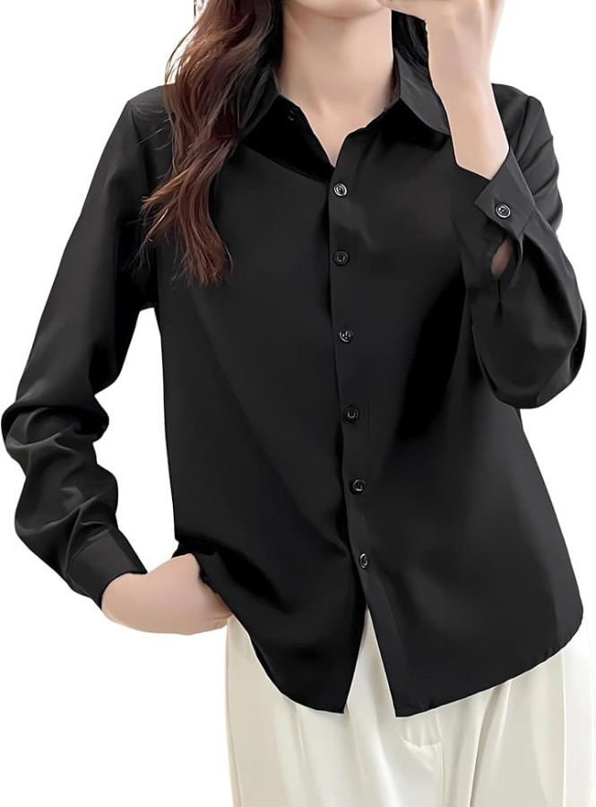 Women's long-sleeved, plain dress shirt/blouse with regular collar. Suitable for office casual wear, work, or student.